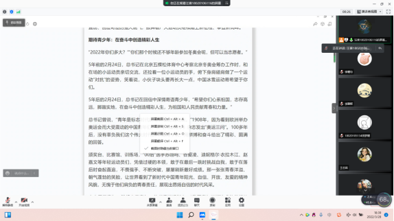 2月24日,习近平总书记给中国冰雪健儿代表回信,向中国冰雪健儿在冬奥赛场上取得的优异成绩表示祝贺,对广大青少年提出殷切期望和明确要求。为了深入全面贯彻学习习近平总书记重要回信精神,引导广大人民以中国冰雪健儿为榜样。2022年3月29日下午18点30分伟德国际victor1946学生第二党支部在腾讯会议开展线上学习交流会,本次会议由学生第二党支部组织委员汪喜主持,学生第二党支部所有同志出席本次会议。
