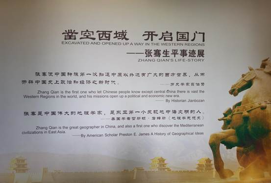 “驼铃古道丝绸路,胡马犹闯唐汉风”,想到这句诗,就不禁想起了张骞两次出使西域的重大历史事件和张骞不平凡的一生。陈列馆里利用图片、沙盘、视频、VR等多种手段,围绕“入仕长安为郎,历险出使西域”、“匈奴对峙”、“请缨再使西域,丝路连接东西”、“城固说汉”等内容,以张骞故里文化为主线,讲述张骞出使西域的丰功伟绩和张骞故里深厚的历史文化底蕴。张骞两次出使西域,一次出使西南夷,开拓商道,缔结友好,传播华夏文明,开通了横贯东西、连接欧亚的丝绸之路。他开拓的后世闻名的“丝绸之路”,促进了中国与西域之间的政治、经济和军事、文化的交流,促进了当时汉夷之间的第一次文化交融,丰富了当时汉族人民的文化生活,对促进人类文明的发展贡献甚大。