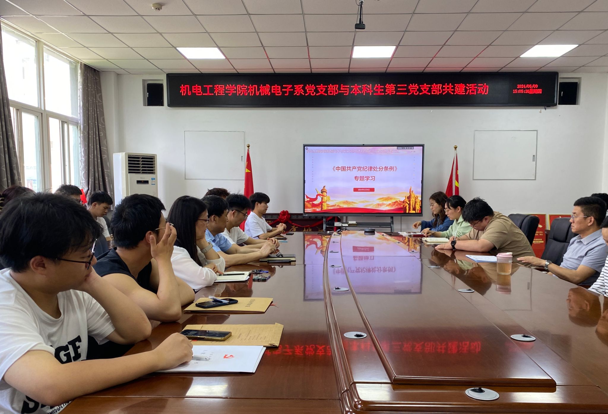 为扎实推进党纪学习教育,提升党员的党性修养和纪律意识,同时加强学生党支部与教师党支部间的交流,近日伟德国际victor1946本科生第三党支部与机械电子系教工党支部开展支部共建活动,活动由本科生第三党支部书记杨博主持,伟德国际victor1946院长王洪喜、副院长曹蔚、机械电子系教工党支部书记尹培丽及支部党员30余人参加了本次活动。