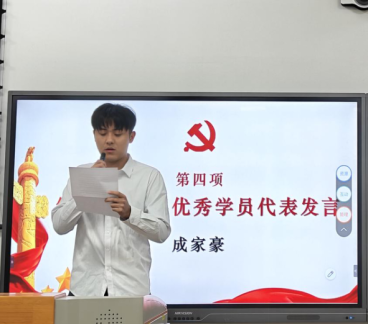 成家豪代表第70期党课优秀学员发言,呼吁大家不忘初心、以本次积极分子培训班为起点,坚定理想信念,做有理想、敢担当、能吃苦、肯奋斗的新时代好青年。