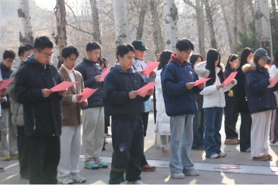 研学途中,师生一行循着革命先辈的足迹,先后走进杨家岭、枣园、王家坪等革命旧址,在现场教学与情景宣讲中,重温党中央在延安13年的光辉历程,感悟延安精神的丰富内涵与时代价值。在延安革命纪念馆,泛黄的文献资料、锈迹斑斑的革命文物、生动再现历史场景的复原景观,每一幅照片背后都藏着感人至深的故事,每一件文物都承载着厚重的革命记忆。讲解员结合历史背景,详细解读了延安精神的形成脉络与核心内涵,同学们驻足凝视、认真聆听,不时交流感悟,在沉浸式参观中深刻体悟革命先辈们坚定的理想信念和无私的奉献精神;在张思德广场,大家整齐列队,齐声诵读《为人民服务》篇章。铿锵有力的诵读声回荡在广场上空,既是对革命先烈的深切缅怀,也是对“全心全意为人民服务”根本宗旨的庄严承诺,让同学们在逐字逐句的感悟中,进一步坚定了为人民奉献、为强国担当的信念。